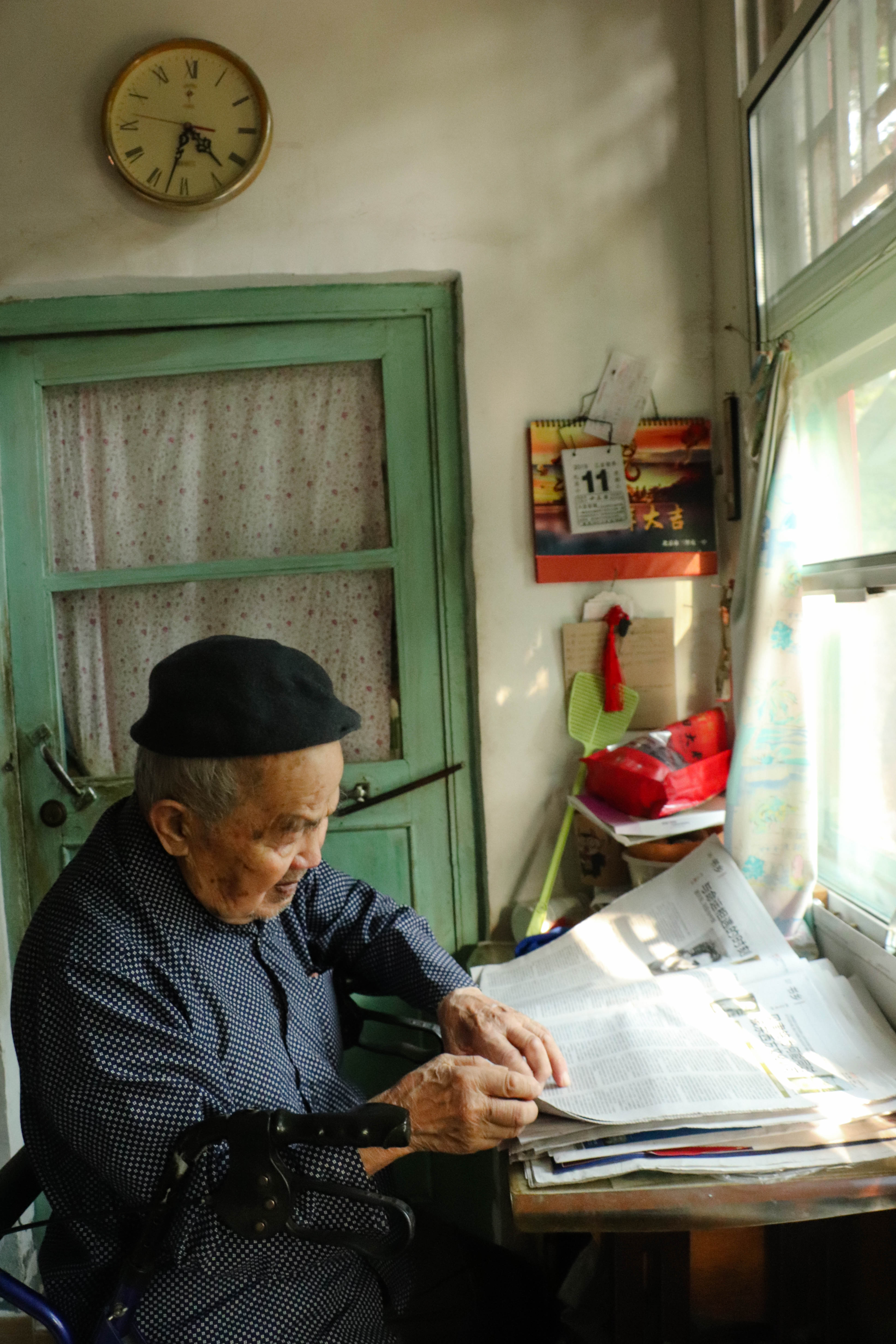 随意抽取一段黄昏时光,张广之老人在桌前看报纸,大儿子在旁边坐着看书,小儿子给父亲喂水,女儿张罗着给父亲做饭。我们常说的岁月静好大概就是如此这般吧。老人的眼神依然清亮,若不说明很难相信他已经走过了整整一百年的光阴,而大儿子张世弘看起来也不像70岁的人。
