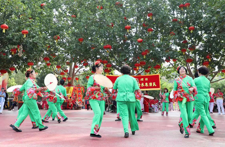 在非遗互动区,太平鼓正在表演。