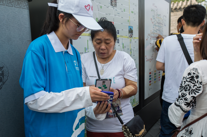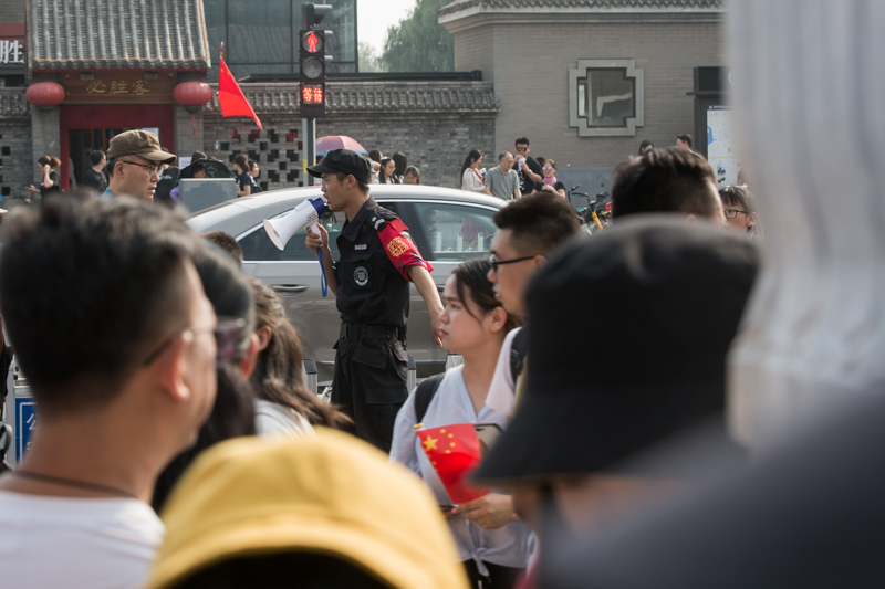 南锣鼓巷牌坊处,工作人员疏导游客。
