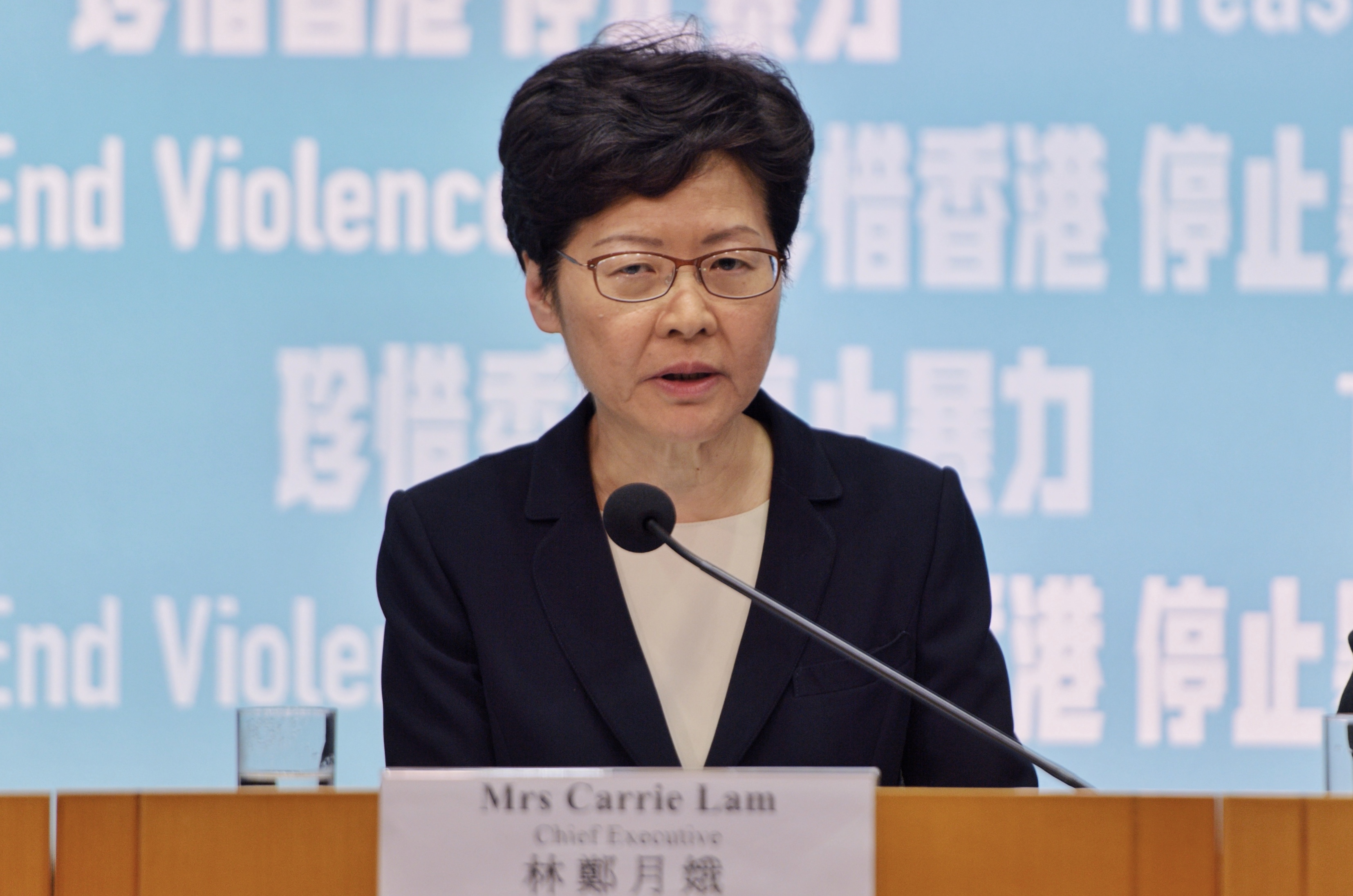 林郑月娥在会上宣布实施《禁止蒙面规例》。 新京报特派香港报道组 摄