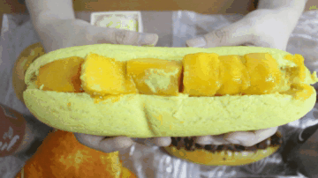 这款“芒芒包”里的芒果不仅个个“大块头”,而且非常新鲜,咬上一口,感觉芒果的香气充满了整个口腔。柔软的面包,甜而不腻的奶油,配上酸酸甜甜的芒果,味道棒极了。可即使这个“芒芒包”的颜值和味道要胜于其他大多数面包店里类似的欧包,但终究只是一款芒果奶油面包,没有特别亮眼的地方,在喜茶热麦店里一众网红欧包里难以脱颖而出。