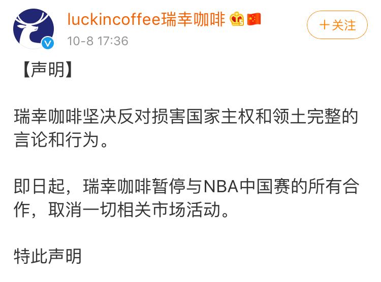 新京报讯(记者 王子扬)10月8日,因休斯敦火箭队总经理莫雷发表不当言论,瑞幸咖啡发布声明称,即日起暂停与NBA中国赛的所有合作,取消一切相关市场活动,两家主题店NBA装饰和体验空间将拆除。