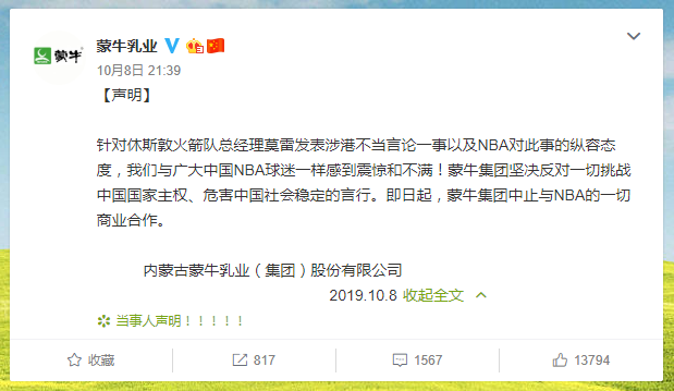 蒙牛集团在声明中表示,“针对休斯顿火箭队总经理莫雷发表涉港不当言论以及NBA对此事的纵容态度,我们与广大中国NBA球迷一样感到震惊和不满!蒙牛集团坚决反对一切挑战中国国家主权、危害中国社会稳定的言行。即日起,蒙牛集团中止与NBA的一切商业合作。”