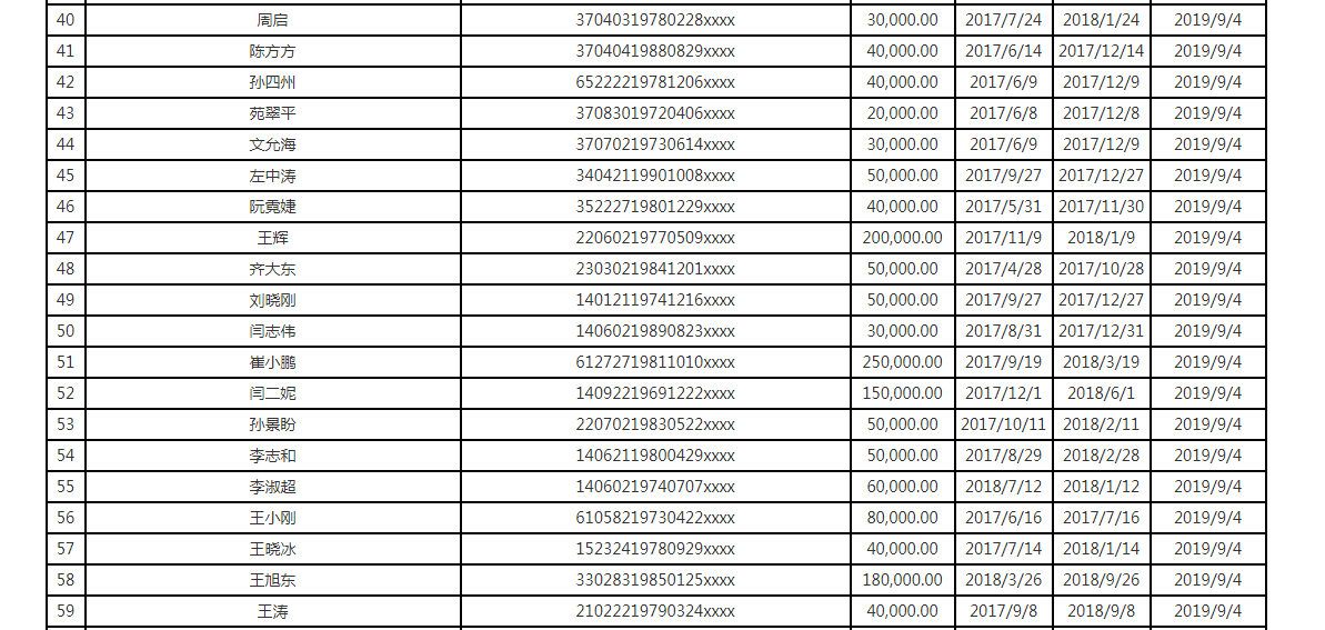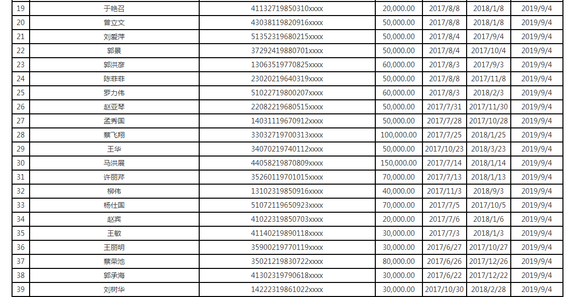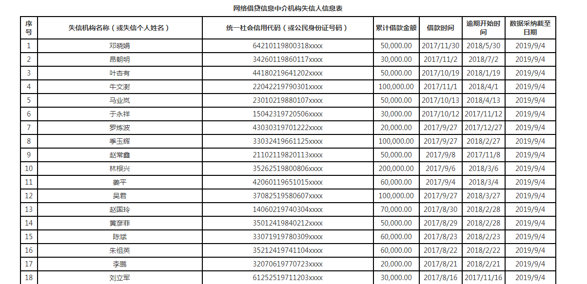 新京报讯(记者 黄鑫宇 陈鹏)在深圳市互联网金融协会(下称“深圳互金协会”)自7月30日连续发布10批总计3319名网贷失信人(含失信机构)名单后,10月8日,深圳市地方金融监督管理局(下称“深圳金融监管局”)官网发布网贷失信惩戒第一批失信人名单的通知。记者注意到,不同以往,在本次通知中所发布的74条失信网贷借款人,除“统一社会信用代码(或公民身份证号码)”一项最后四位打码外,其余各项均显示为失信人的真实姓名、借款金额或时间(如图1-4所示)。