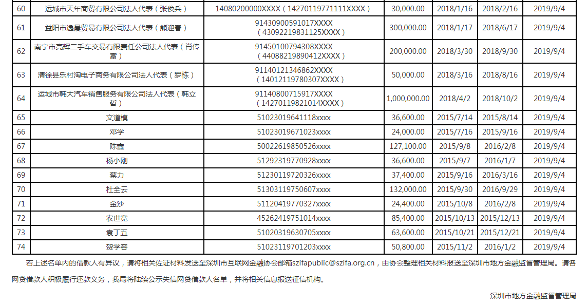 深圳金融监管局对此表示,根据此前发布的《关于加强深圳市网贷行业严重失信行为联合惩戒工作的通知》,为落实失信惩戒工作,各网贷平台及深圳互金协会已先后公示多批失信人员名单。为进一步维护网贷行业秩序,加强失信惩戒力度,深圳金融监管局对深圳互金协会报送的数据进行信息整理、资料评估、数据筛查,现发布第一批失信网贷借款人名单。