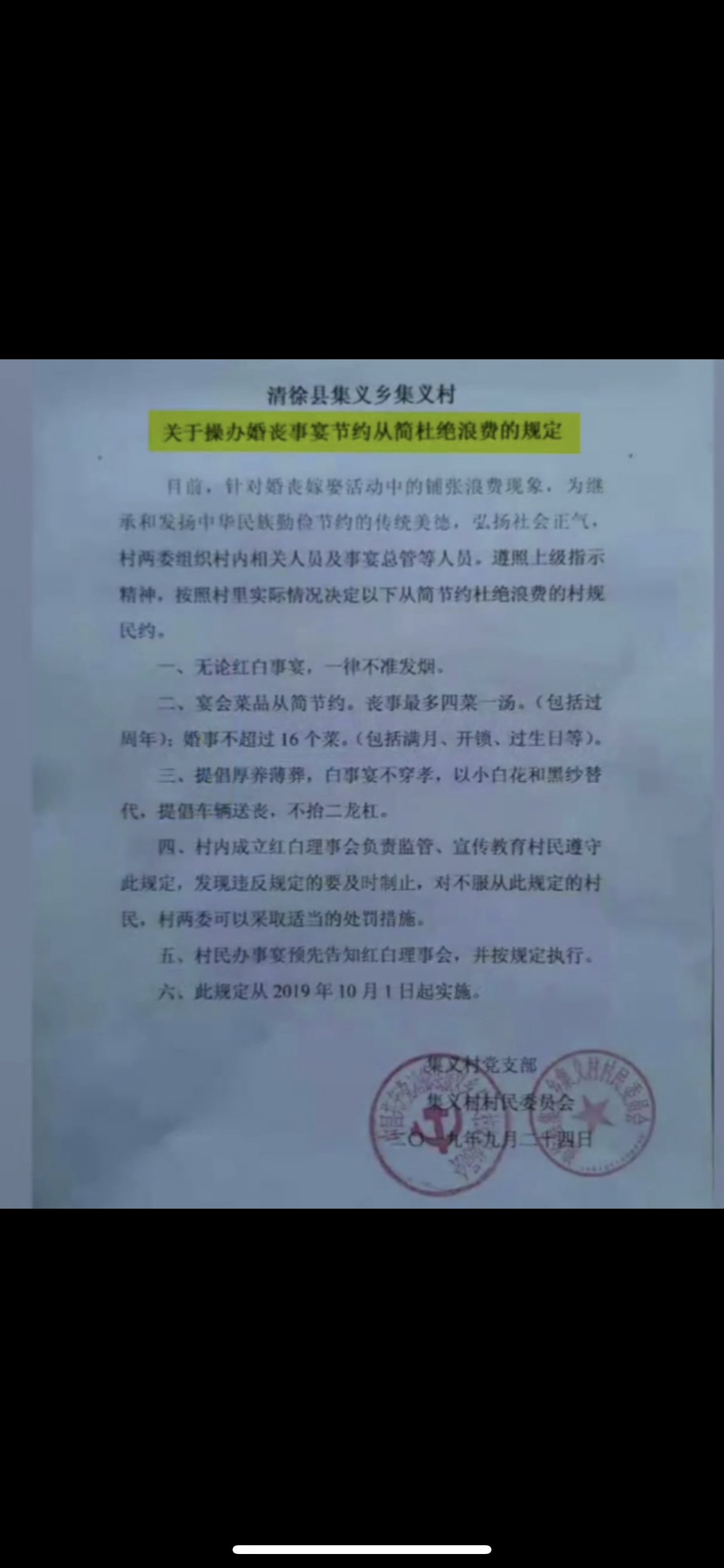 集义村关于操办婚丧事宴节约从简杜绝浪费的规定。网络截图