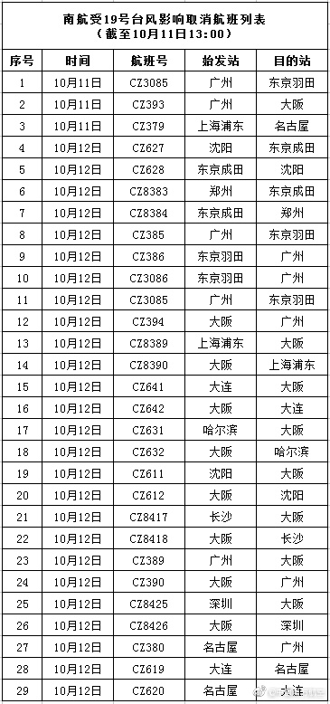 新京报讯(记者 王真真)10月11日,新京报记者从中国南方航空官方微博获悉,受19号台风影响, 截至今日13:00,南航已取消10月12日在东京、大阪、名古屋机场进出港的26个航班。
