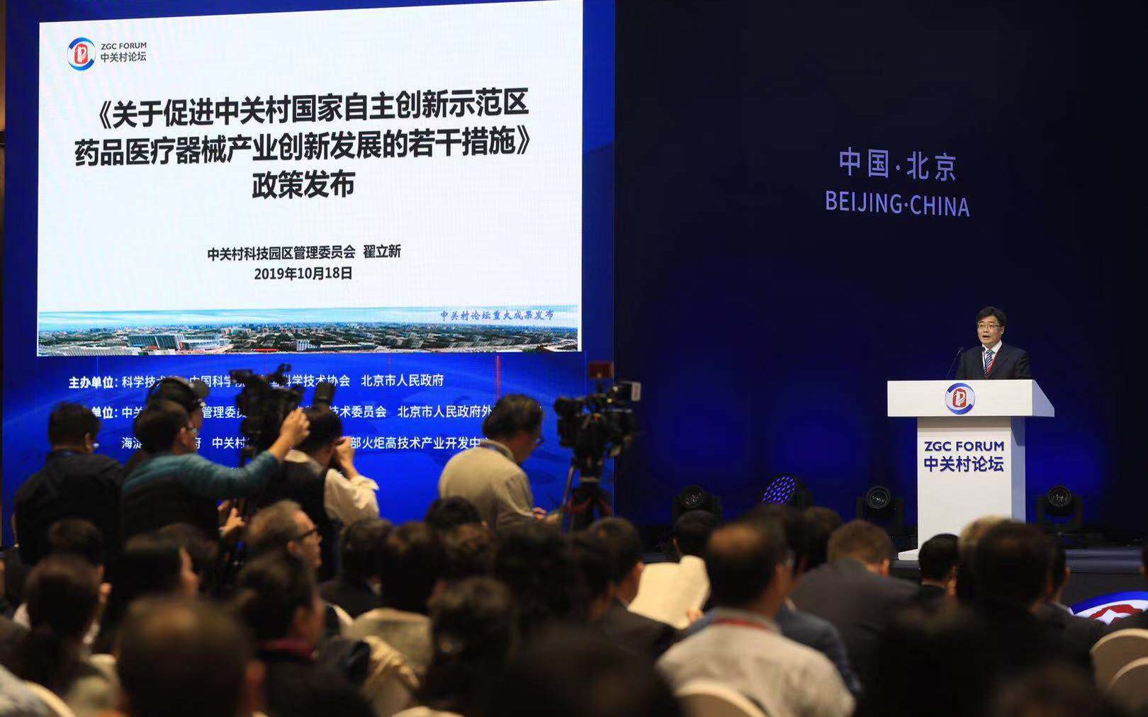 中关村管委会主任翟立新在2019中关村论坛重大成果发布会上讲话。摄影/新京报记者 浦峰