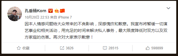 然而,同日22时53分,孔垂楠本人在个人微博发布声明称,“因本人情感问题给大众带来的不良影响,深感愧疚和歉意。我宣布将暂缓一切演艺事业和相关活动,用充足的时间来解决私人事务,最大限度降低对双方以及双方家庭的伤害。”随后,“孔垂楠宣布暂停演艺活动”这一话题登上微博热搜。