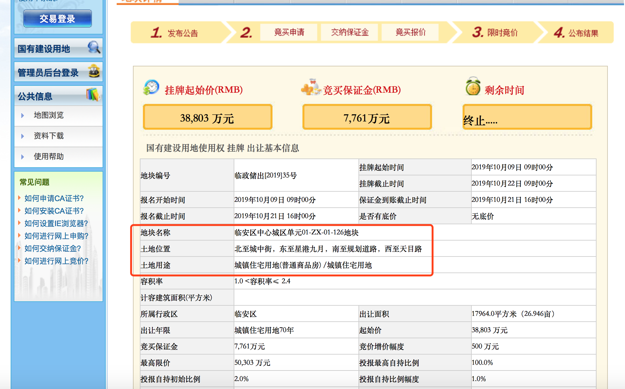 新京报记者登录浙江省国土资源网上交易系统发现,位于临安中心城区的一地块“国有建设用地使用权”已终止交易。交易开始时间为2019年10月9日9时,结束时间为2019年10月22日9时。交易终止前,涉事地块挂牌出让的用途为“城镇住宅用地”。