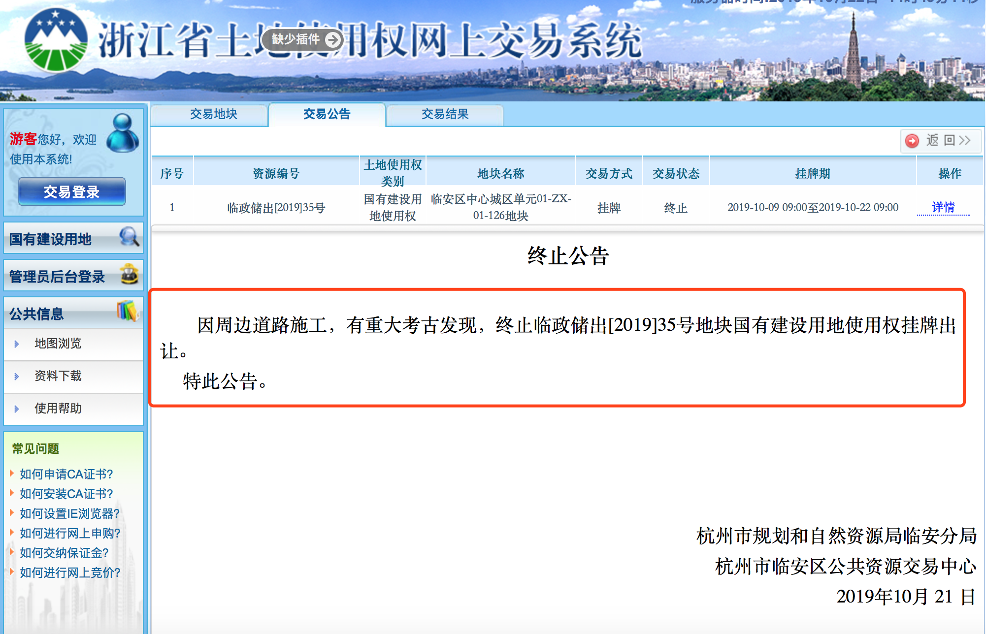 杭州市规划和自然资源局临安分局、杭州市临安区公共资源交易中心联合发布的“终止公告”显示,因周边道路施工,有重大考古发现,终止临政储出【2019】35号地块国有建设用地使用权挂牌出让。