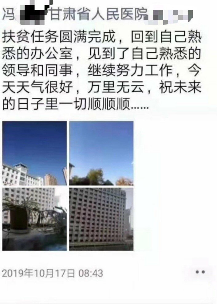 10月23日,甘肃省人民医院的一名医生告诉新京报记者,冯某某之前在武山县人民医院进行下乡帮扶工作,昨日是她第一天回医院上门诊。其向新京报记者提供的朋友圈截图显示,冯某某于10月17日上午发布动态消息称,“扶贫任务圆满完成,回到自己熟悉的办公室,见到了自己熟悉的领导和同事,继续努力工作,今天天气很好,万里无云,祝未来的日子里一切顺顺顺……”