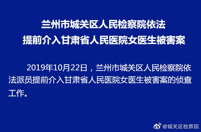 2019年10月22日,兰州市城关区人民检察院依法派员提前介入甘肃省人民医院女医生被害案的侦查工作。详情>>>