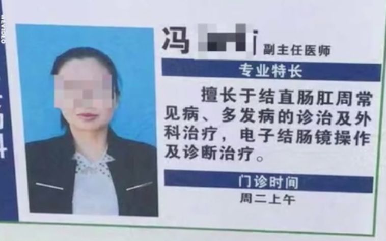 医院官网显示,冯医生,副主任医师、医学硕士,擅长于结直肠肛周常见病等诊治,在核心期刊发表论文8篇。据报道,事发后该医院未停诊。详情>>>