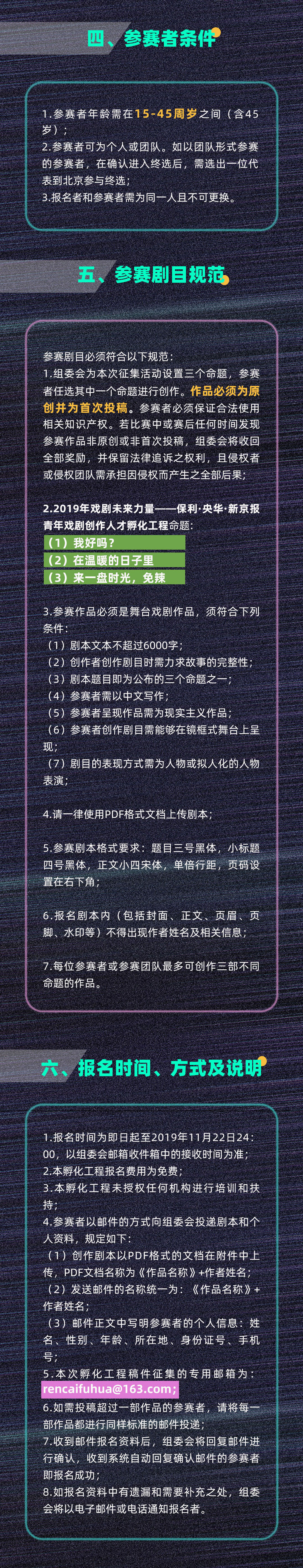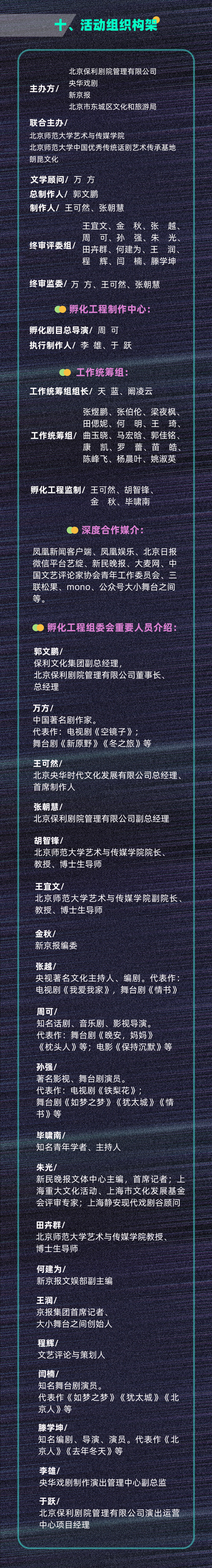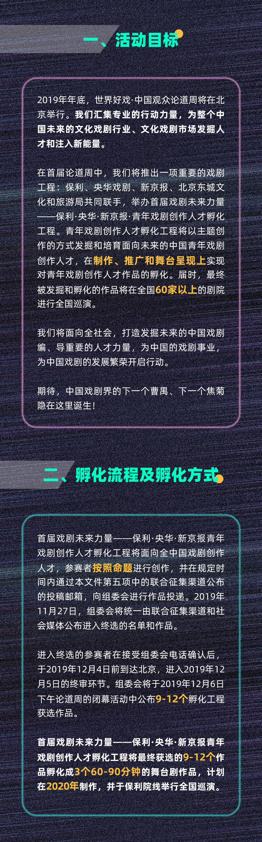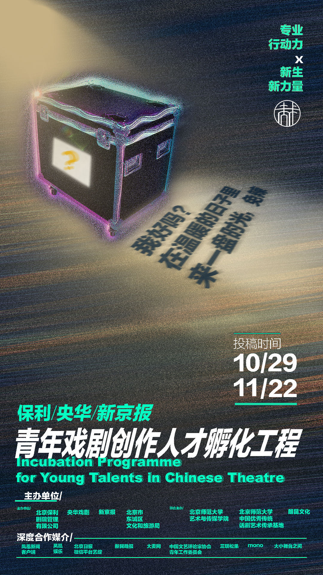 由保利、央华戏剧、新京报、北京市东城区文化和旅游局共同联手举办的首届“戏剧未来力量—— 保利·央华·新京报青年戏剧创作人才孵化工程”从10月29日起面向全社会招募,寻找并扶植优秀的青年戏剧人,为其提供戏剧创作机会和作品推广平台。