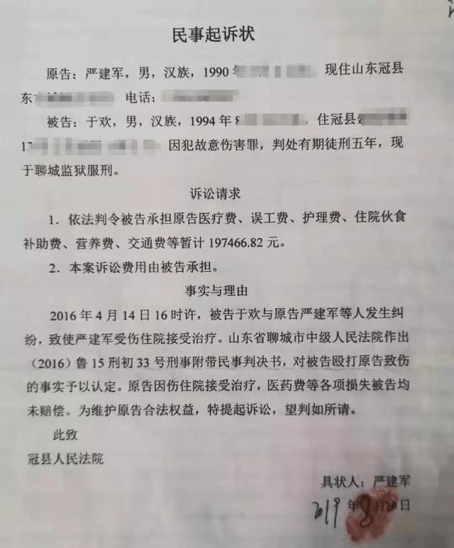 严建军家属提供的民事起诉状显示,于欢因犯故意伤害罪,判处有期徒刑五年,现于聊城监狱服刑。严建军请求“依法判令被告承担原告医药费、误工费、护理费、住院伙食补助费、营养费、交通费等,暂计197466.82元。