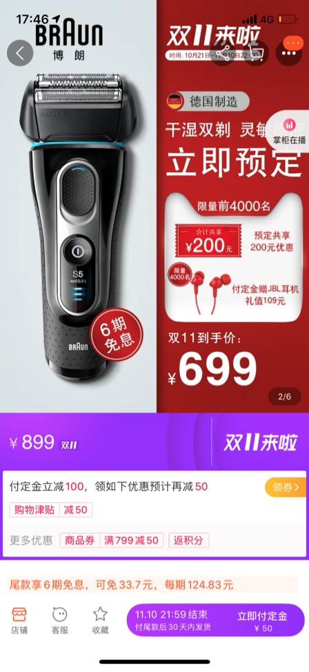 举几个具体的例子:例如下图这款博朗剃须刀,预售价899元,定金50元,付定金减100元,尾款899-50-100=749元,还可使用店铺50元券(商品页领取)和满400减50的购物津贴,最终实付699元,与商家标的到手价一致。