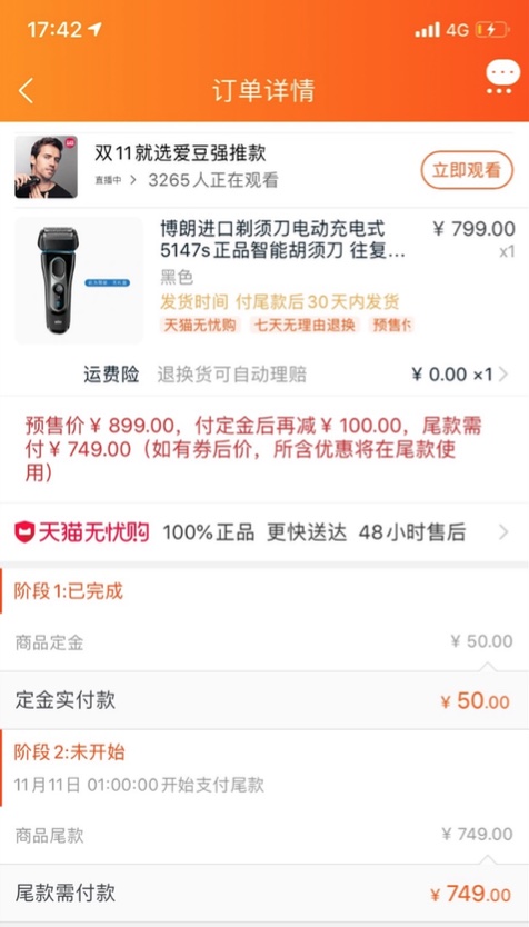 博朗剃须刀付款页 图/淘宝截图