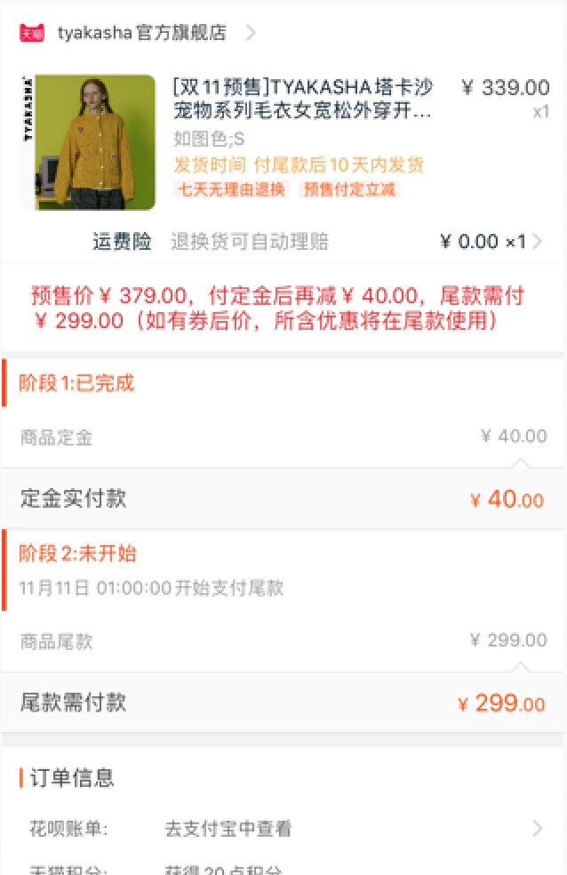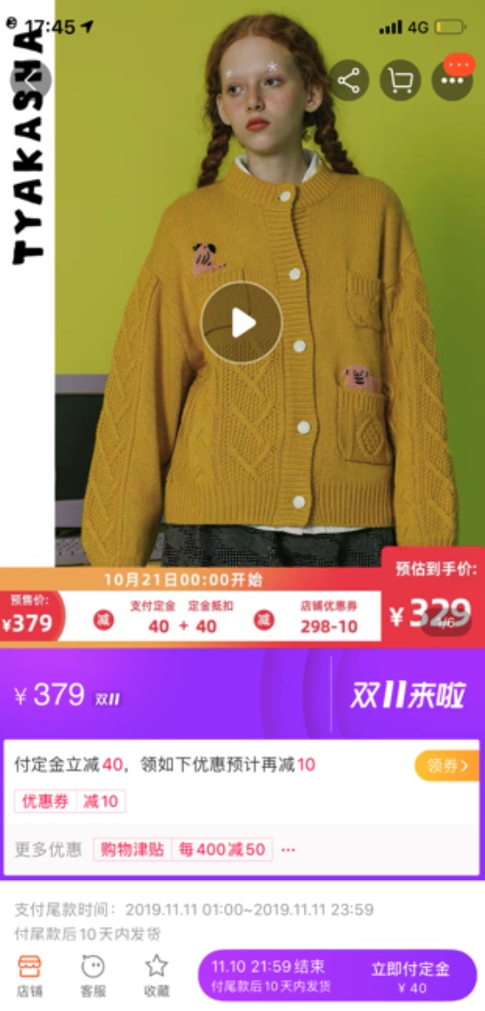 另外,比如下图塔卡沙女士毛衣,预售价379元,定金40元,尾款减40后299元,还可使用店铺10元券,最终实付329元,与商家标的到手价一致。