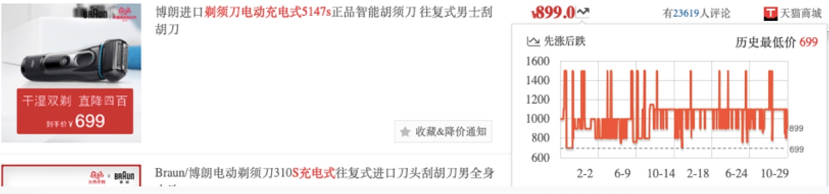 同时,从某比价网站上可以看出,这款博朗剃须刀,699元已是半年内的最低价了,并且低于大部分同类产品的价格,前4000名付定金赠送价值百元的耳机,还是比较值得入手的。