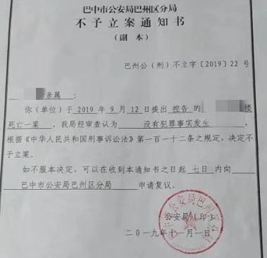 巴州警方向死者家属下发的不予立案通知书。 受访者供图