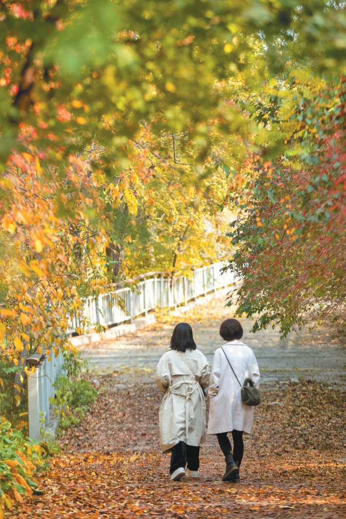 场景:两名游客走在满是落叶的林间小径中。新京报记者 李凯祥 摄