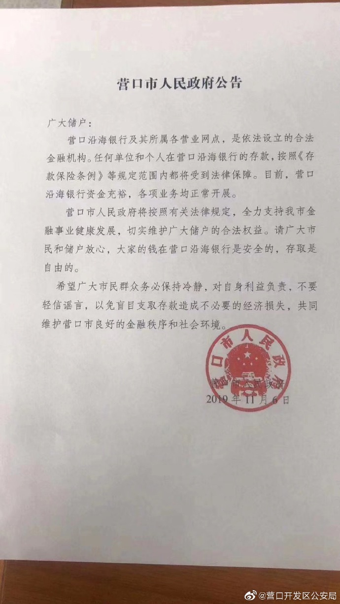 新京报讯 11月6日晚,营口开发区公安局官方微博上发布通报称,营口市人民政府发布相关公告表示,营口沿海银行及其所属各营业网点,是依法设立的合法金融机构。任何单位和个人在营口沿海银行的存款,按照《存款保险条例》等规定范围内都将受到法律保障。目前,营口沿海银行资金充裕,各项业务均正常开展。