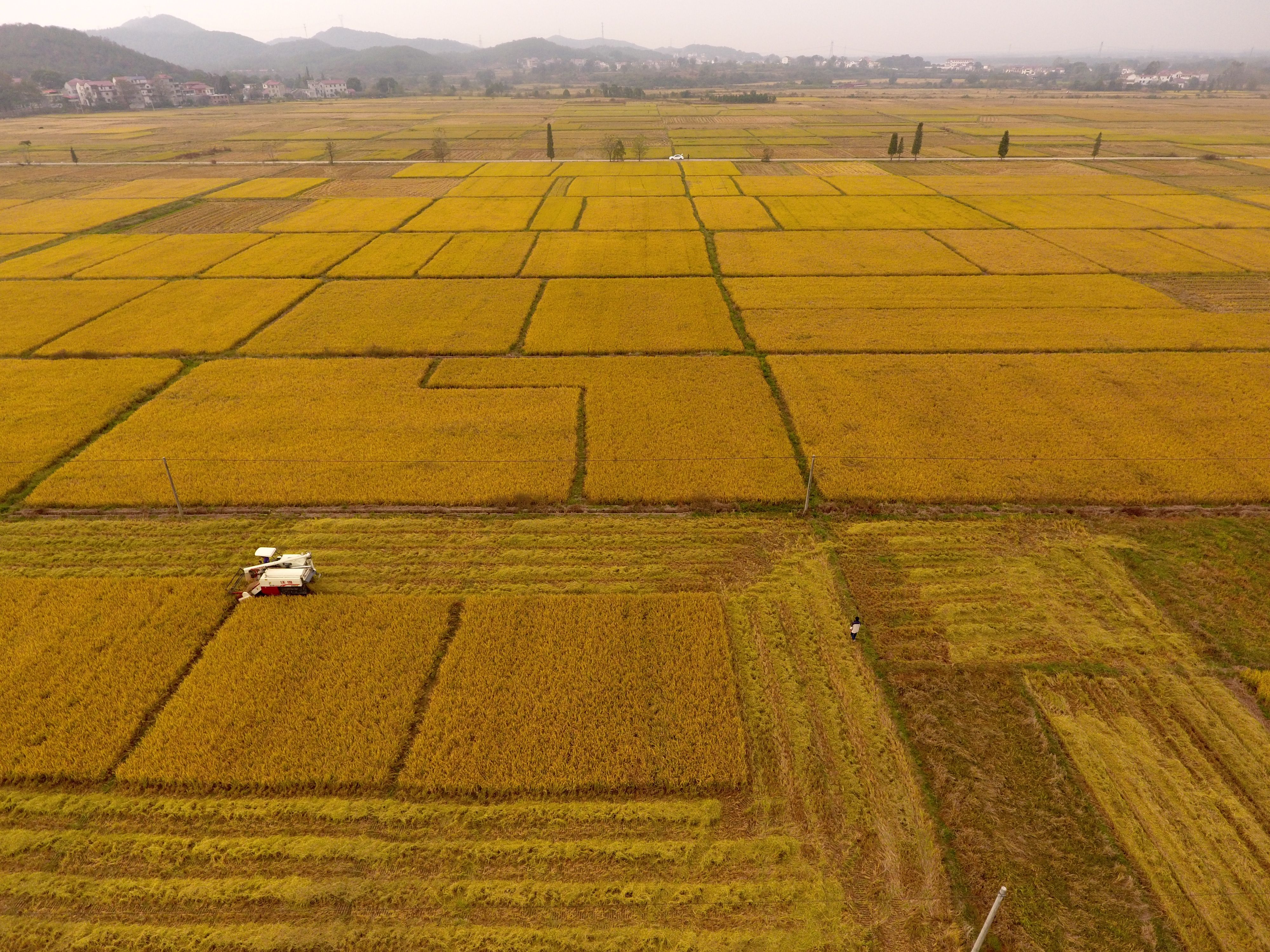 11月6日,记者在江西吉安县看到,这里的晚稻大部分刚刚收割完毕,但仍有小部分还在进行最后的收割,在福田寺村附近的一片耕地示范区中,金黄的稻穗迎风摇曳,在收割机的巨镰下变成稻谷。周边的稻田大多已经收割完毕,只留下半截秸秆还在水田中立着,不少村民在收割完毕的稻田里放牛。