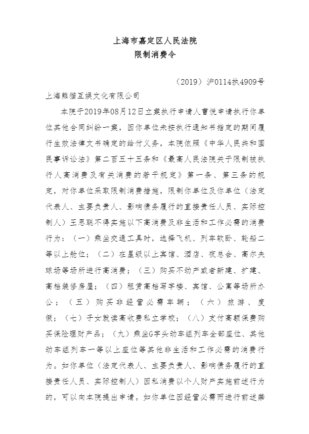 限制消费令显示,法院于2019年08月12日立案执行申请人曹悦申请执行上海熊猫互娱文化有限公司其他合同纠纷一案,因熊猫互娱未按执行通知书指定的期间履行生效法律文书确定的给付义务,被采取限制消费措施。