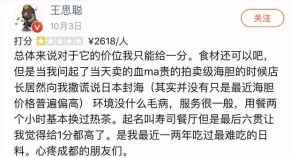 而在此番“限高风波”之前,王思聪上一次上热搜,还是因为他在成都花一万多吃了一顿日本料理,因为对服务不满意而在网上打了差评。店家被打差评本是一种损失,但是由于差评来自王思聪,却成为一个传播性极强的事件,相当于为店家打了广告。