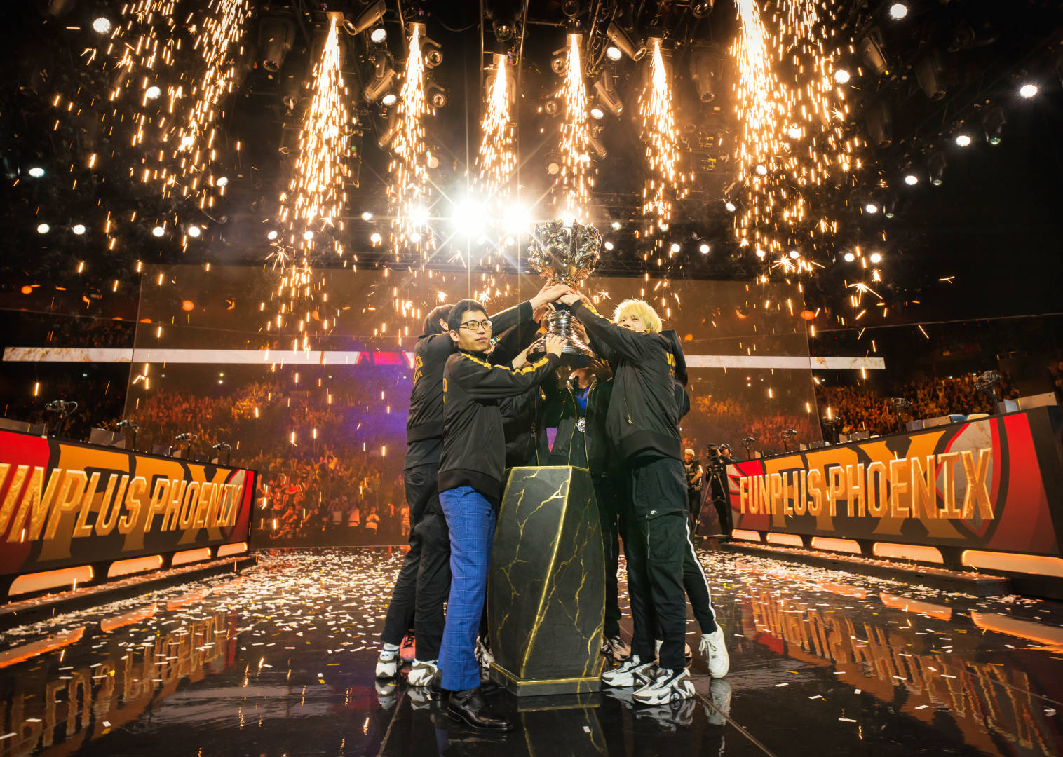 FPX捧起冠军奖杯。英雄联盟官方摄影师 一村 摄