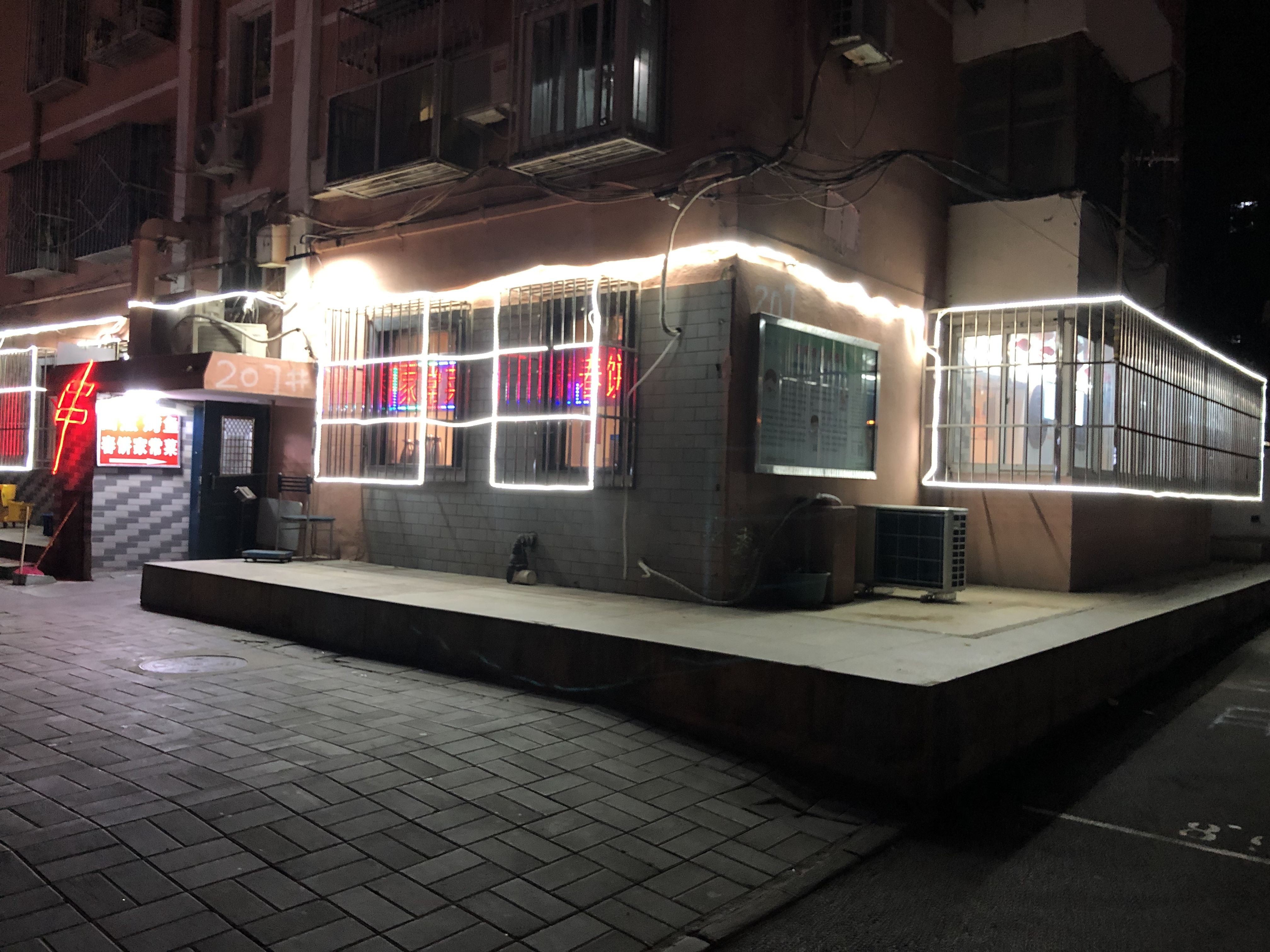 一单元一层4户全部属于一家家常菜馆,除了一间当成厨房,其余三间每间房屋都摆着十几张桌子供客人用餐。临街的一层房屋窗户外全部贴着LED灯。窗户上醒目地张贴着“春饼”、“家常菜”、“卤煮”“串”等字样。服务员站在单元门口招呼来往顾客。