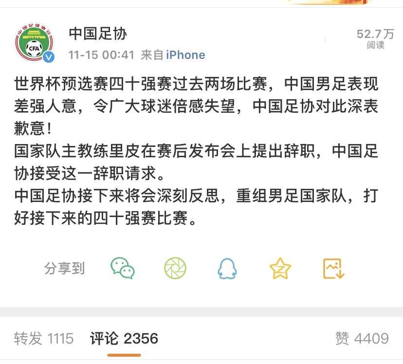 在里皮宣布辞职后不久,中国足协通过社交媒体给出回应,“国家队主教练里皮在赛后发布会上提出辞职,中国足协接受这一辞职请求。”足协方面表示,“接下来将深刻反思,重组男足国家队,打好接下来的40强赛。”