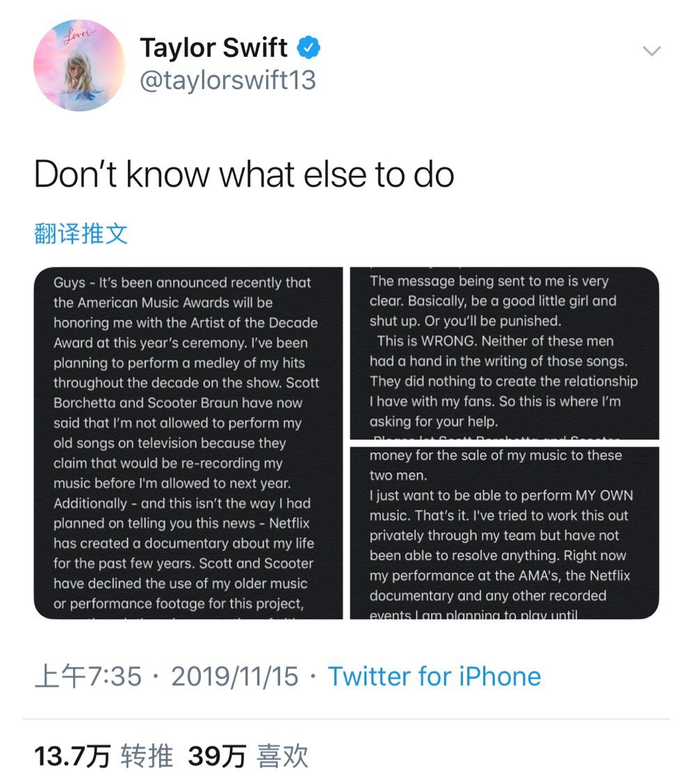 而此次针对斯考特的要求,霉霉向网友求助道,“我分享发生在我身上的事情,我希望我的故事可以改变其他艺人的意识水平,尽可能帮助他们避免类似的命运。然而他们给我的信息很清楚,基本上就是叫你做个乖女儿,闭嘴,否则你会受到惩罚。这显然是错误的。这些人都没有参与这些歌曲的创作。他们没有做任何事来建立我和我的粉丝之间的关系。所以这就是我要你们帮忙的地方。”