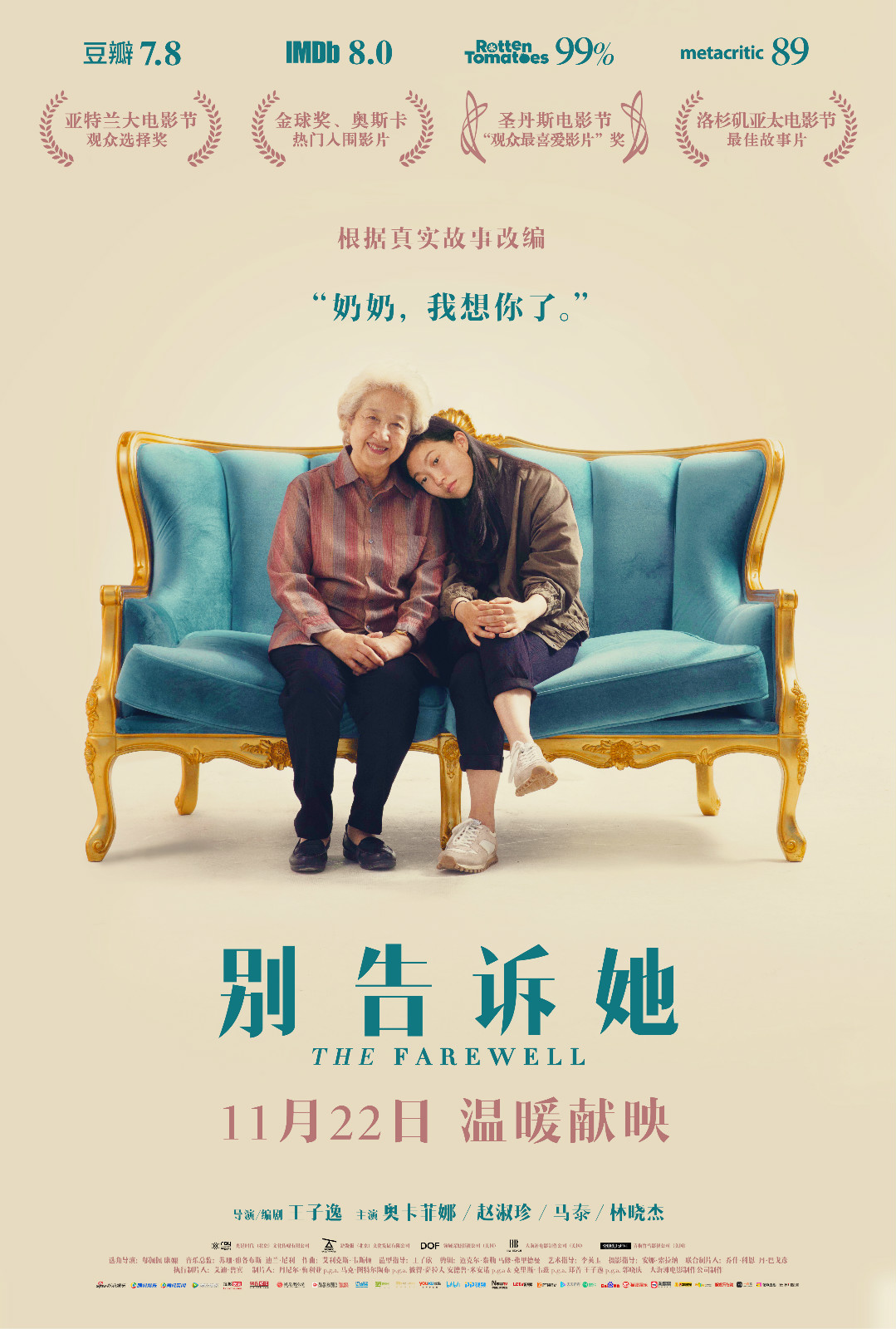 新京报讯(记者 周慧晓婉)11月19日,将于11月22日全国上映的电影《别告诉她》今日发布终极预告和终极海报。电影因善意的谎言开始了一场啼笑皆非的“婚礼喜剧”,而女主角碧莉也在这个过程中完成了自己的成长历程,学会了与所爱之人说再见。被媒体称为“2019北美年度黑马”的电影《别告诉她》,年初在圣丹斯电影节斩获“观众最喜爱影片”奖,近期更拿下了有奥斯卡重要风向标之称的哥谭独立电影奖最佳影片、最佳剧本和最佳女演员三项大奖提名。除此之外,电影还选报了明年金球奖的最佳外语片奖项,在奥斯卡颁奖季中呼声日渐高涨。