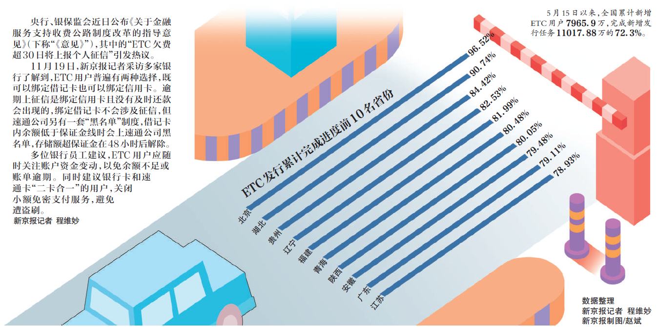 11月19日,新京报记者采访多家银行了解到,ETC用户普遍有两种选择,既可以绑定借记卡也可以绑定信用卡。逾期上征信是绑定信用卡且没有及时还款会出现的,绑定借记卡不会涉及征信,但速通公司另有一套“黑名单”制度,借记卡内余额低于保证金线时会上速通公司黑名单,存储额超保证金在48小时后解除。