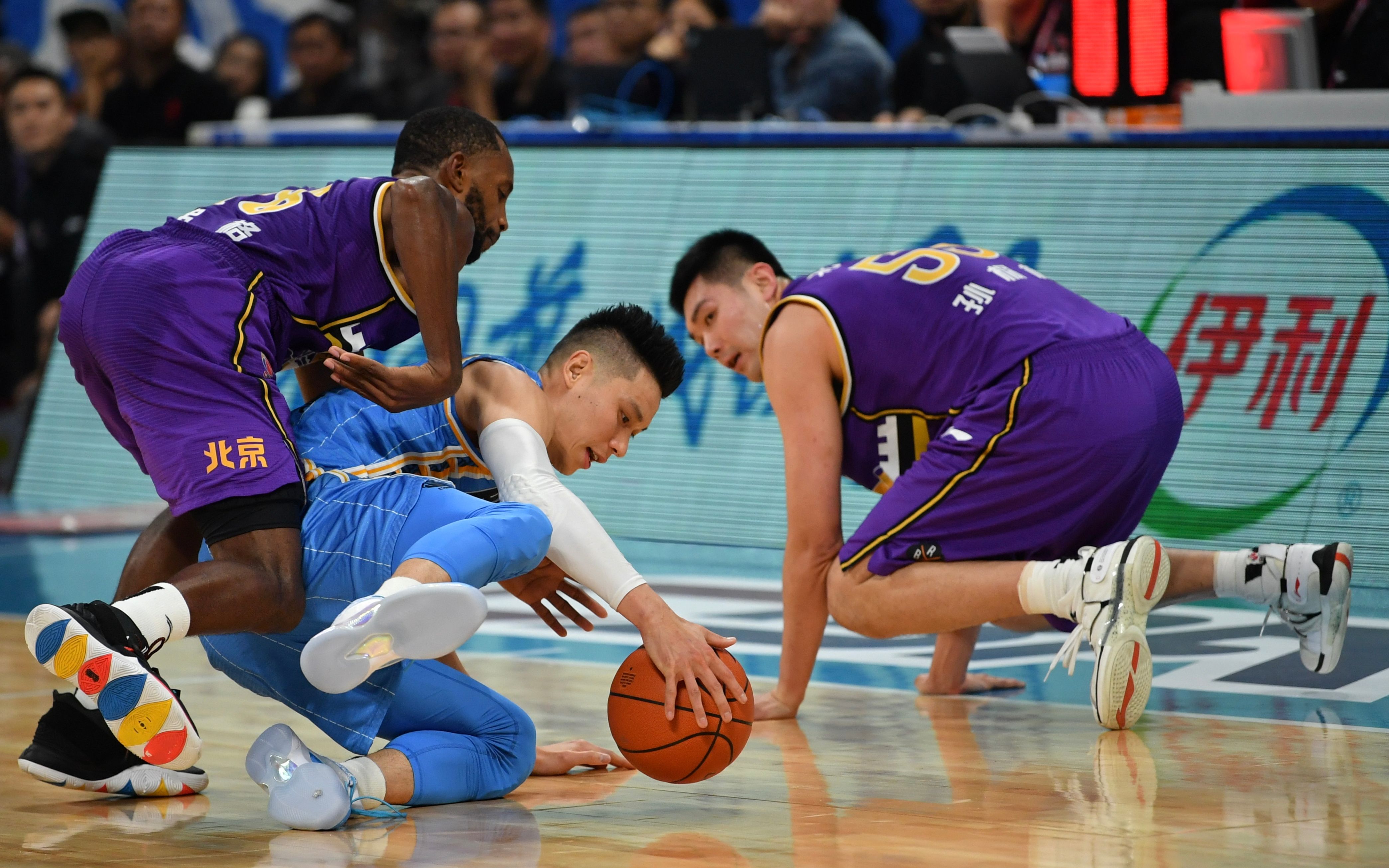 林书豪遭包夹拼到倒地。 新京报记者 吴江 摄