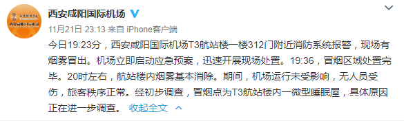 新京报快讯 据西安咸阳国际机场官方微博消息,11月21日19时23分,西安咸阳国际机场T3航站楼一楼312门附近消防系统报警,现场有烟雾冒出。机场立即启动应急预案,迅速开展现场处置。20时左右,航站楼内烟雾基本消除。期间,机场运行未受影响,无人员受伤,旅客秩序正常。