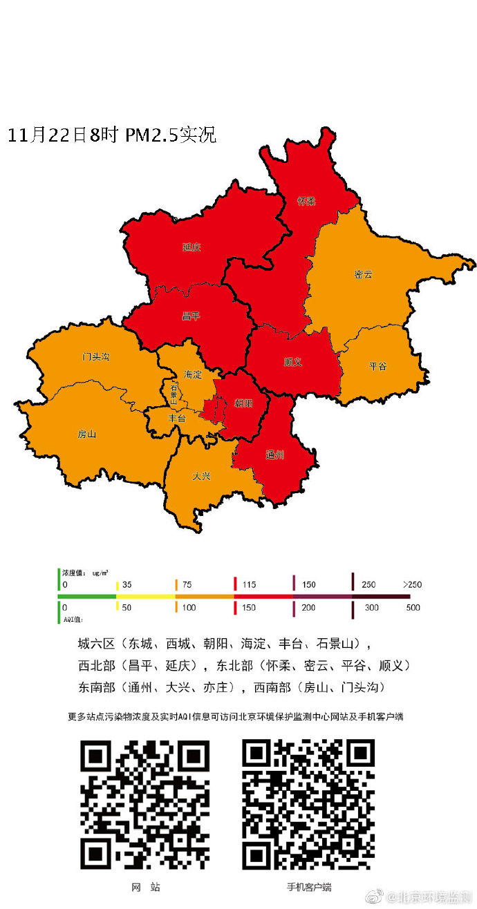 据悉,11月21日夜间至11月22日早晨,北京市PM2.5浓度均值维持在110-120微克/立方米之间,持续偏东风作用下,东部及西北山前地区污染较重,达4级中度污染,其余地区以3级轻度污染为主。