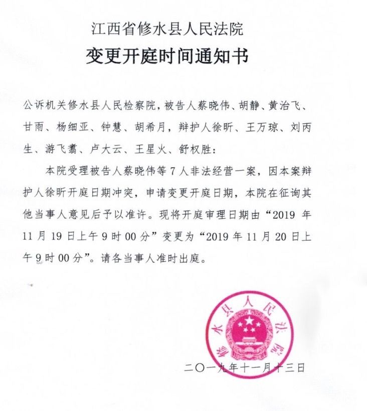 2019年6月6日,此案二审由九江市中院在修水县法院开庭。