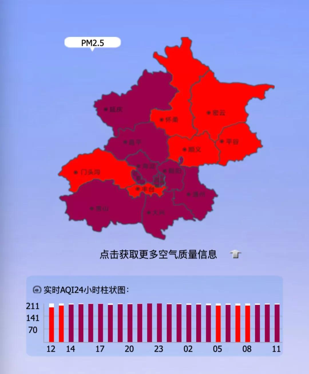 昨天夜间,北京地区受高压前部渗透作用,偏东北小风,东北部地区略有好转,不过全市PM2.5均值仍维持在148-161微克/立方米之间,为重度污染水平。