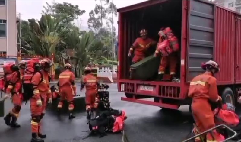 消防员正在将设备装车,前往震中进行灾情排查。视频截图