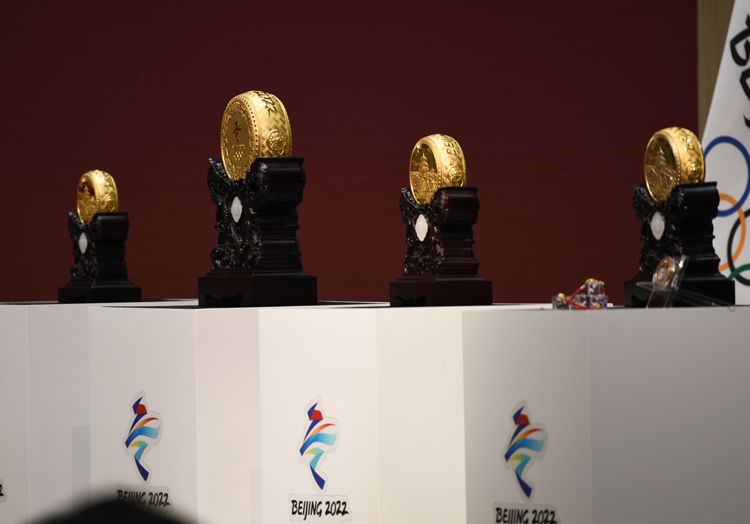 “鸿运金鼓”正面呈现北京2022年冬奥会会徽。