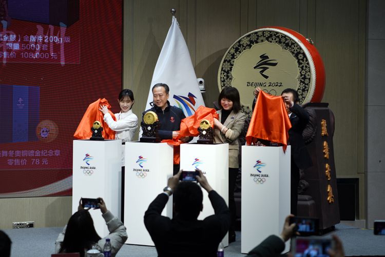 11月26日,冬奥组委嘉宾为冬奥特许商品“鸿运金鼓”系列新品揭幕。