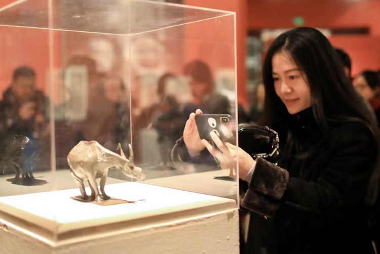 翁帆拍摄一件小牛雕塑。