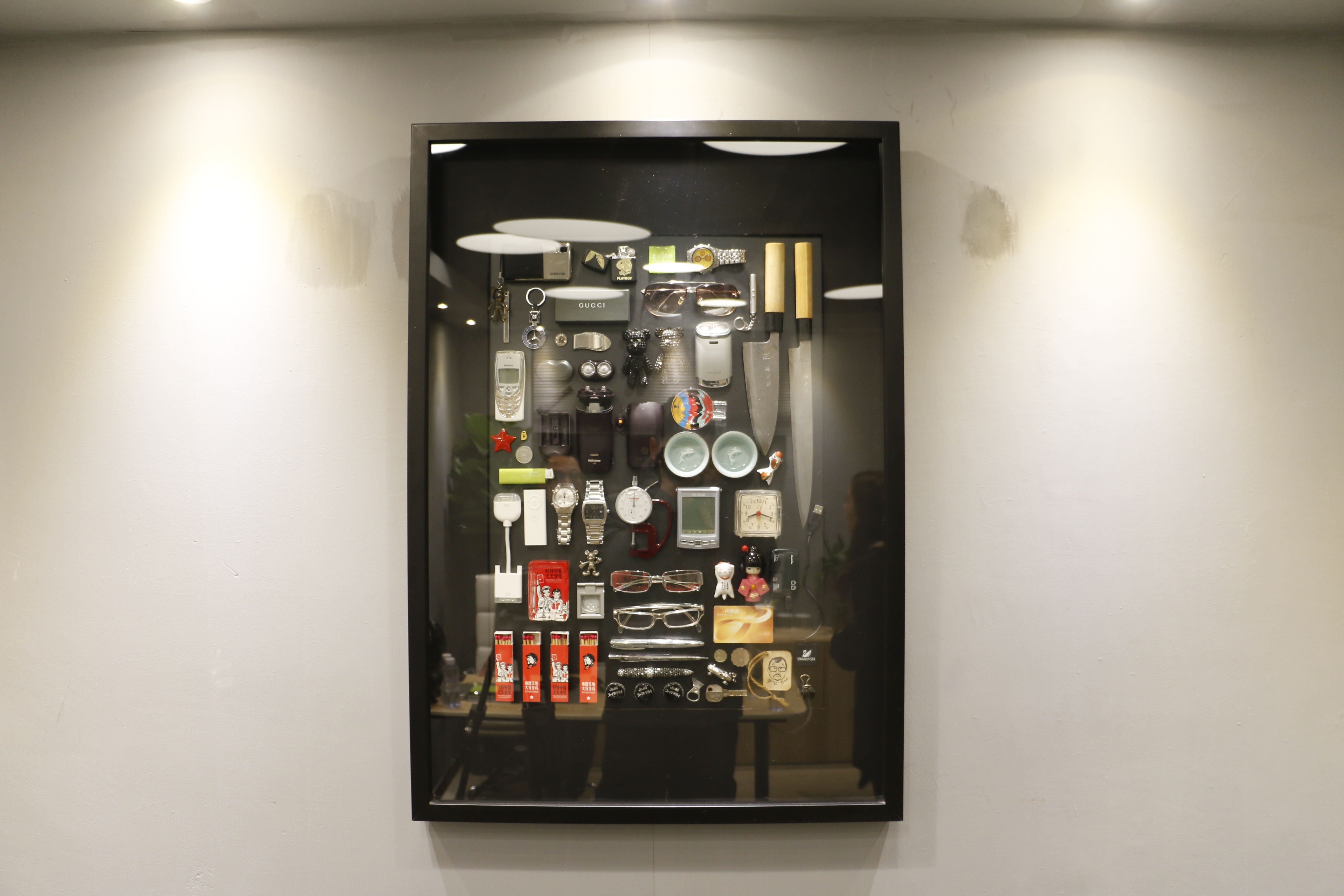 卡纸器、翻译机、万能读卡器、硬币……一堆“小玩意儿”整齐地陈列在裱框里,这都是方大卫在北京生活近20年的印迹,其中不少是他从香港带来的设计工具。裱框正对着办公桌,工作间隙一抬头便能看见,方大卫将其命名为“北京20年”。