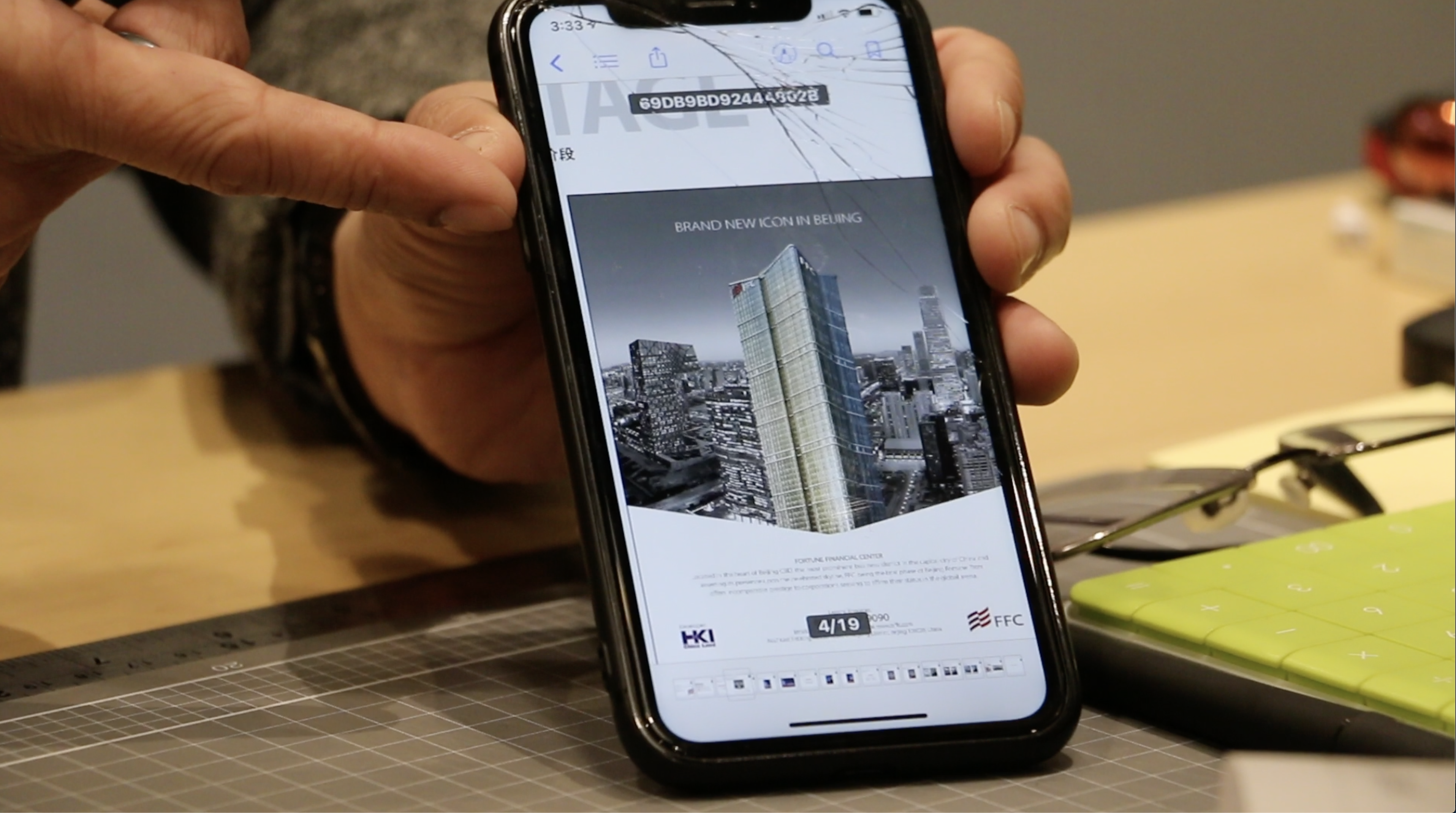 方大卫用手机展示自己设计的logo。实习生 鲍松炎 摄