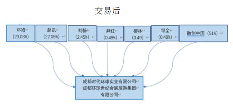 根据此前披露信息,本次城投投资拟挂牌的股权包括环球世纪51%股权以及时代环球51%股权。除去挂牌的该部分股权后,环球世纪、时代环球其余的股权均由邓鸿、赵凯、刘杨、邹全、柳林、尹红等人持有,且二者持股比例相同。