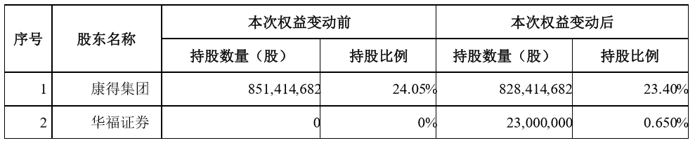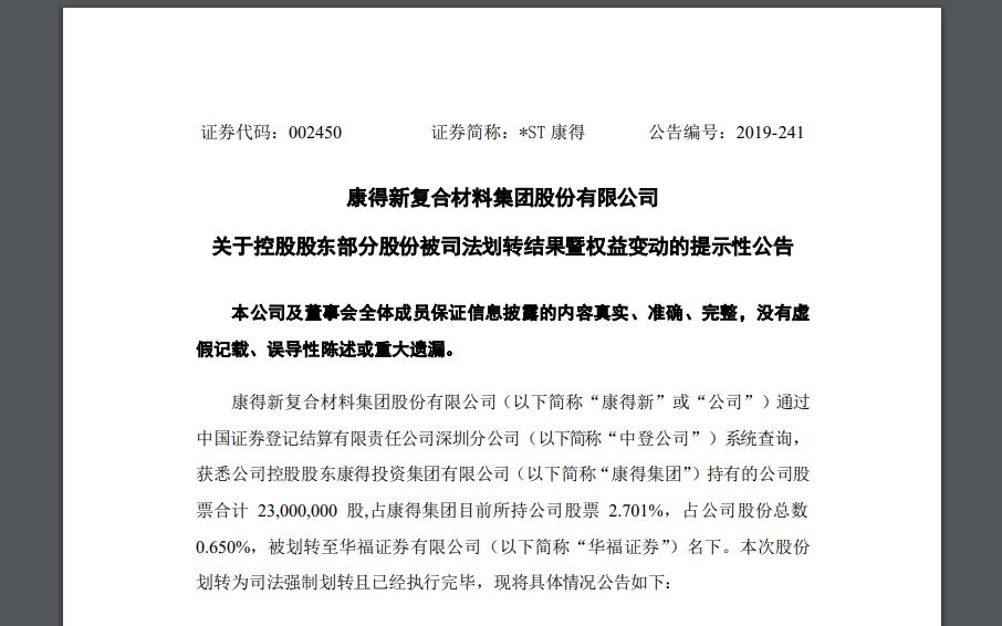据了解,该部分股份占康得集团目前所持康得新股票的2.701%,占康得新股份总数0.650%。康得新表示,该司法划转已经执行完毕,截至公告披露日,康得集团持有公司股份8.2841亿股,约占公司总股本的23.40%,康得集团仍为公司控股股东。康得新2019年三季度报显示,康得集团所持有的康得新股份已全部被冻结。