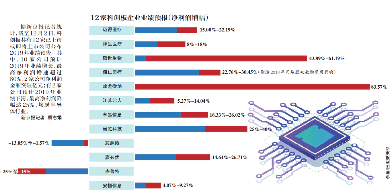 据新京报记者统计,截至12月2日,科创板共有12家已上市或即将上市公司公布2019年业绩预告。其中,10家公司预计2019年业绩增长,最高净利润增速超过80%,2家公司净利润金额突破亿元;有2家公司预计2019年业绩下滑,最高净利润降幅达25%,均属半导体行业。